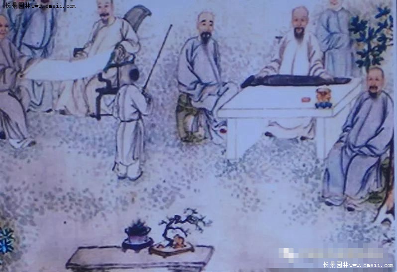 6.王維為什么要在盆中放一塊對蘭蕙的生長盛衰沒有任何關(guān)系的石頭呢?更值得人們深思的是馮摯在記述文字中沒有使用“置”、“放”、“擺”、“擱”等常用字,而選用了一個(gè)讓人頗感意外的“養(yǎng)”字。有人不禁要問:本無生命特征的石頭怎么能“養(yǎng)”呢?唯一的答案只能是,身為唐代大詩人、大畫家、大音樂家的王維,在將自己的繪畫經(jīng)驗(yàn)和“詩言志”、“詩緣情而發(fā)”的詩歌創(chuàng)作理念以及音樂的節(jié)奏、節(jié)拍、旋律、和聲、曲式等藝術(shù)特性和理論等借鑒于盆景創(chuàng)作以后,作為盆景的基本表現(xiàn)元素、本無生命的石頭,就產(chǎn)生了一種奇妙的蛻變。于是,在王維眼中,這塊本無生命的綺石,驟然間華麗轉(zhuǎn)身為一塊擬人化的有生命的“活石”了。而把這樣一塊“活石”“養(yǎng)”起來,也就變得合情合理了。這塊綺石不僅對盆景營構(gòu)畫面起到了烘托、渲染的作用,更重要的是它滿足了創(chuàng)作者對心理情感、意志品質(zhì)、社會人生乃至宇宙精神的訴求??梢院敛豢鋸埖卣f,王維的盆景“養(yǎng)以綺石”,是中國盆景史上一項(xiàng)前無古人、無與倫比的偉大創(chuàng)舉。中國盆景從此有了各種配件的廣泛應(yīng)用,有了藝術(shù)意境的創(chuàng)作追求,有了詩情畫意的審美境界。更為重要的是王維的這一創(chuàng)舉,對確立中國盆景的藝術(shù)地位,起到了至關(guān)重要的催化、支撐和穩(wěn)固的作用。王維的“養(yǎng)以綺石”還歷史性地開創(chuàng)和規(guī)范了中國盆景的基本表現(xiàn)模式,即石與植物的組合。王維的這種盆景模式,受到后世文人特別是文化精英們的熱切關(guān)注和大力推崇。如施耐庵就曾在其名著《水滸傳》(第81回)中專門寫過宋代的松石盆景:浪子燕青拜訪京師名妓李師師,“入到客位前,見周回吊掛名賢書畫。階檐下放著三二十盆怪石蒼松?!倍嫾依钍啃械摹顿人蓤D》以及清葉芳林、方士庻的《九日行庵文燕圖》(圖4)等,畫的都是樹與石結(jié)合的盆景。再看看當(dāng)代中國盆景,其表現(xiàn)形式豐富多彩,而樹與石組合的盆景更是琳瑯滿目。不管是以樹為主兼以體量很小的單體點(diǎn)綴石組成的盆景,還是以石頭為主兼以樹木為輔的山水盆景、樹附石(圖5)盆景,抑或是石、樹所占比例相差不大甚至幾乎均分的水旱盆景、樹石盆景(圖6)等等,無不是王維盆景制作理念、方法、模式的延續(xù)和拓展。已故著名中國盆景藝術(shù)大師賀淦蓀先生提出的“樹石盆景”概念及其高足、中國盆景藝術(shù)大師張志剛君所著《中國樹石盆景》一書的文化源頭和理論根據(jù),就在這里。